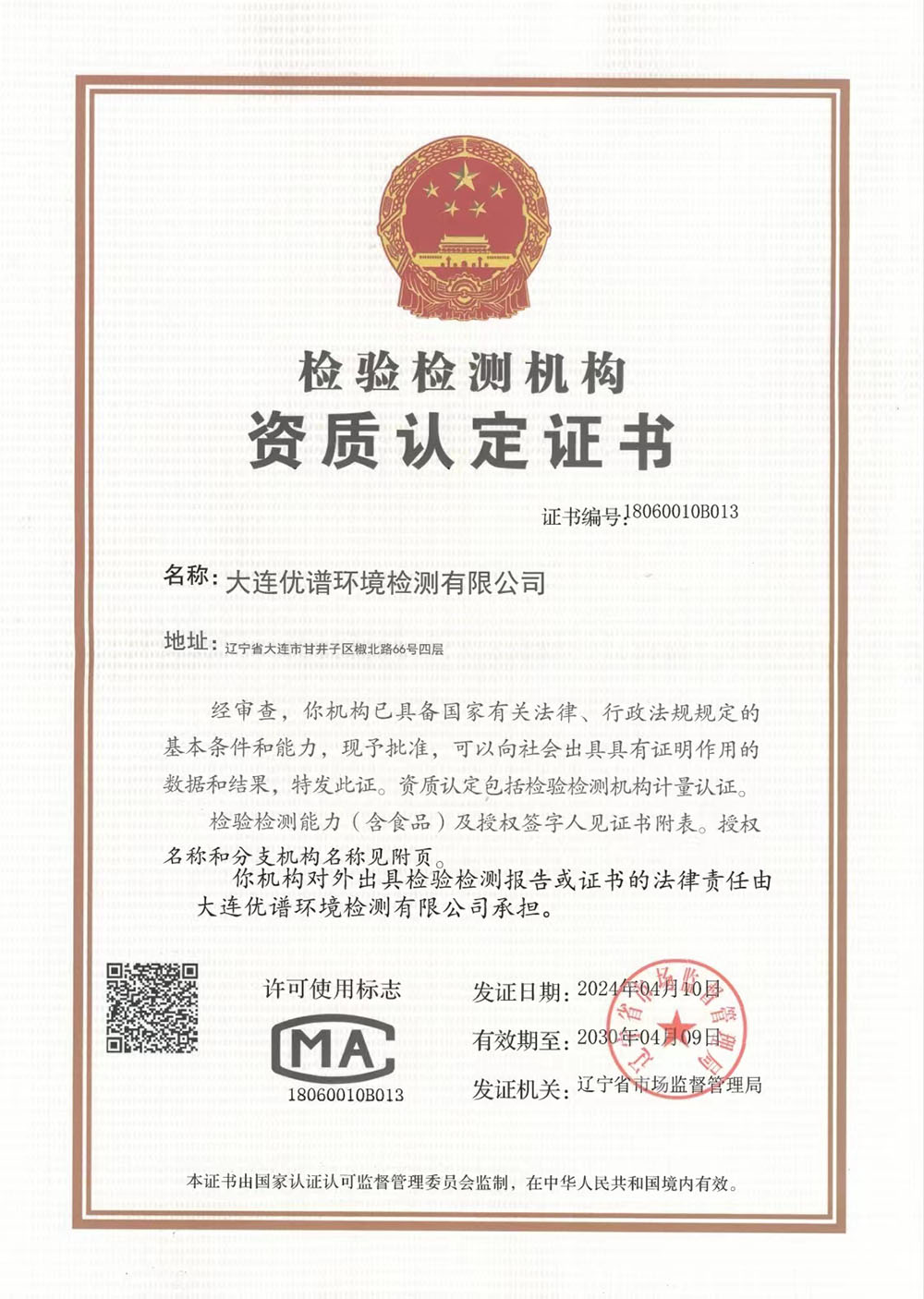 大連優(yōu)譜環(huán)境檢測有限公司是中國領(lǐng)先的第三方權(quán)威檢測機構(gòu)已取得CMA中國計量認證資質(zhì)認定,遼寧省生態(tài)環(huán)境廳備案,具備向社會出具公正數(shù)據(jù)的資格。擁有國際先進的檢測分析儀器和經(jīng)驗豐富的檢測化驗工程師團隊。